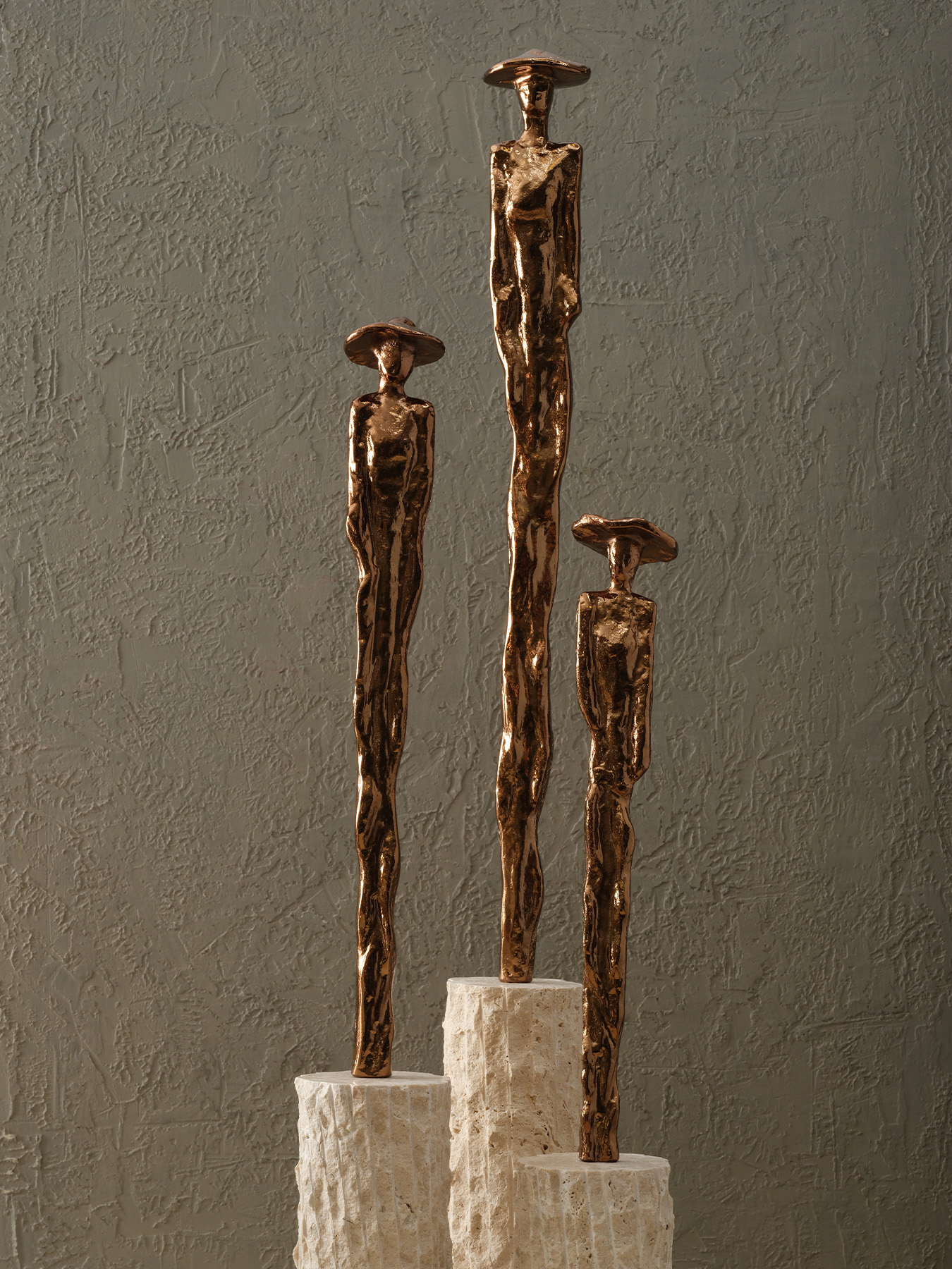 Zarafet, güç ve duruşun heykelsi bir yorumu.Altın tonlu, elongated formdaki kadın figürleri;sadeliği sanata, çizgiyi ifadeye dönüştürüyor.