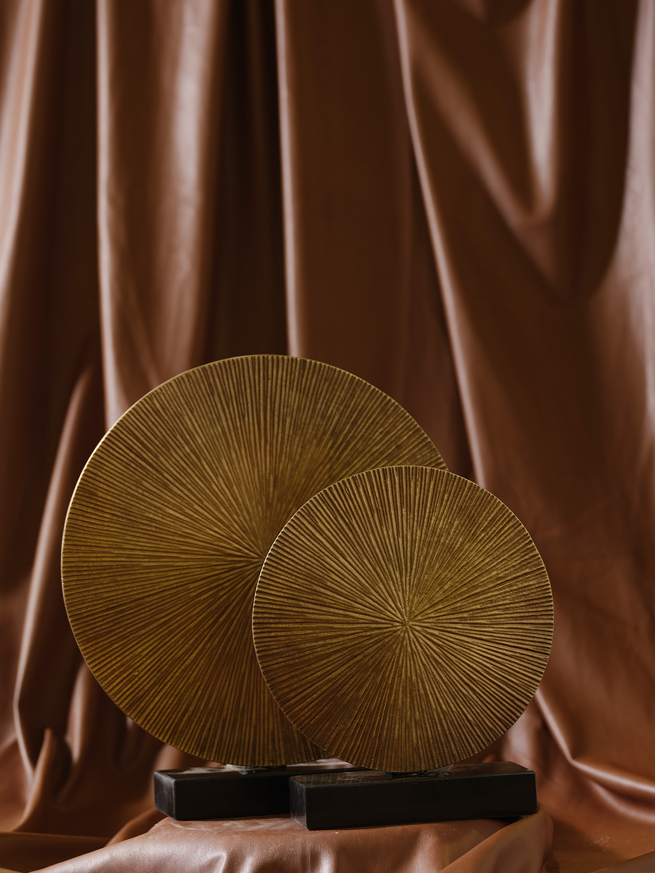 Işığın merkezden yayıldığı güçlü bir form… Yeni Güneş 2’li Dekor, çizgisel dokusuyla hareketi ve enerjiyi heykelsi bir dengeyle yorumlar. Altın tonlu yüzeyi ışığı yakaladıkça derinlik kazanır; mermer kaidesiyle modern ve zamansız bir etki yaratır.